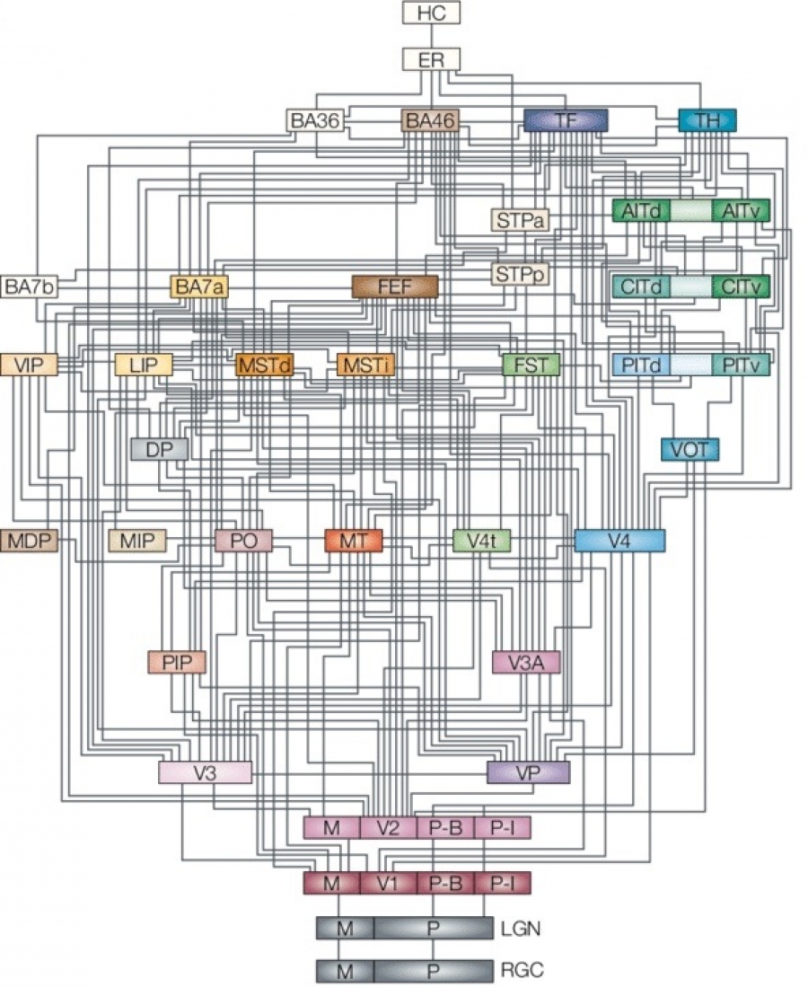 Alulról, a retina felől a talamuszon keresztül érkeznek a jelek, és a feldolgozási hierarchiában egyre magasabbra kerülnek. Az ábrán vonalakkal összekötött dobozok a makákó látórendszerének 32 területét jelölik. Ezek mindegyike átlagosan 6-10 másikkal van összekötve, összesen kb. 120 kapcsolatot alkotva. Ez egy igazi, jó kis elemezni való hálózat. Vannak benne előrecsatolások, visszacsatolások, körök, ugrások, szét- és összetartó kapcsolatok. A látóinformáció a recehártyáról a talamusz oldalsó térdes test nevezetű magján (LGN) keresztül elsősorban a V1-el jelölt elsődleges látó (vizuális) kéregbe kerül, de jut belőle máshova is (főleg a V2, másodlagos vizuális kéregbe).